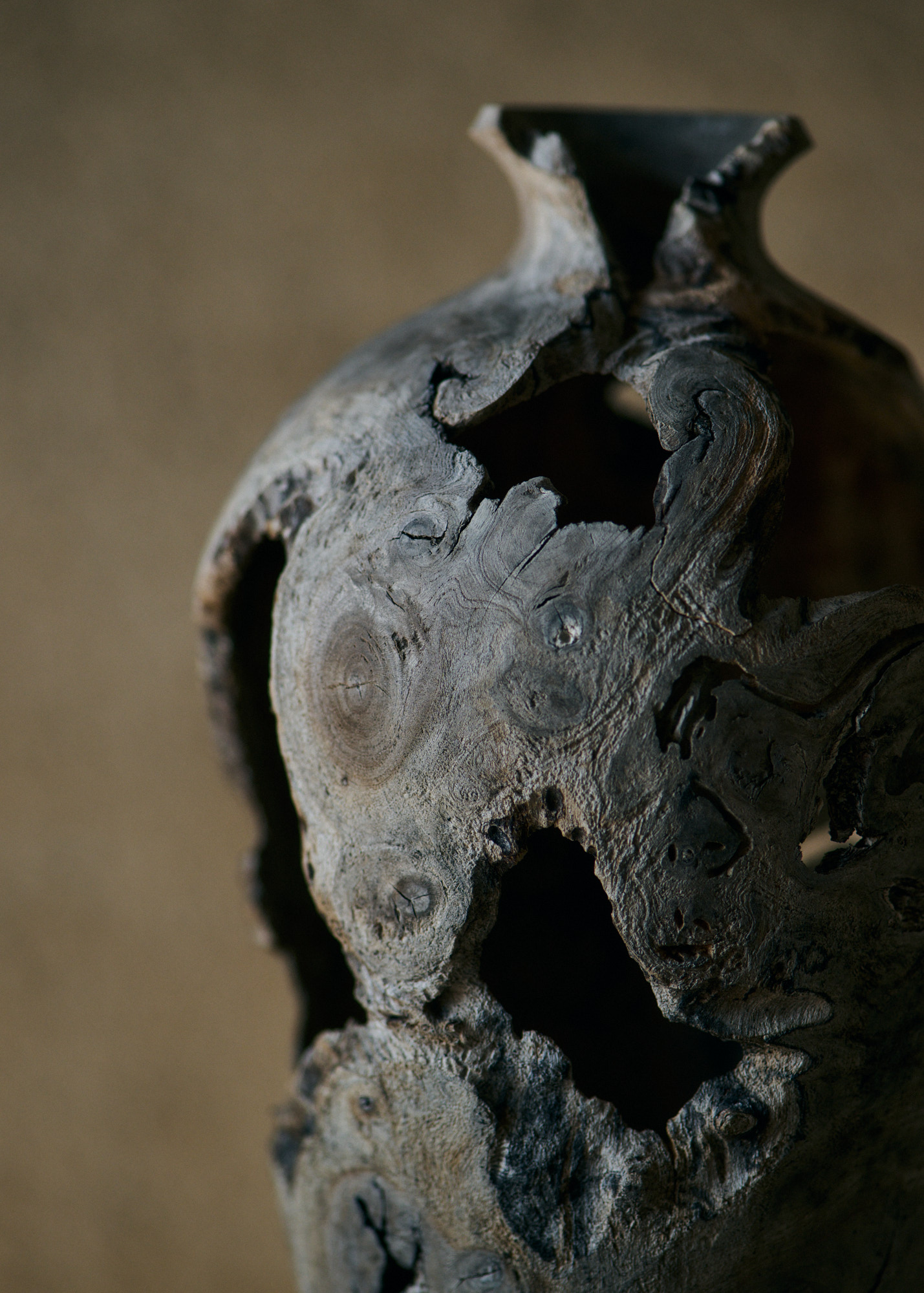 家具製作を学び、木工の技術を身につけたのち、中西は用途を超えた「存在」そのものへと制作の軸を移しました。製材された木ではなく、風雪に晒され、打ち捨てられた切り株や、絡み合いながら生き延びた蔓、雷に裂かれた御神木。そうした木と出会い、その内部に潜むかたちが立ち現れるまで、何年も静かに見つめ続けます。彼が彫り出すのは、木が生きてきた時間の結晶となります。