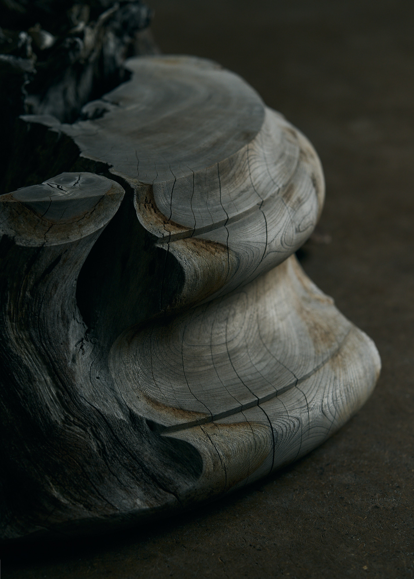 After studying furniture making, Nakanishi gradually shifted the focus of his practice toward exploring existence beyond function. Instead of milled lumber, he works with trees shaped by time and nature: weathered stumps left behind in the forest, vines that have survived through entanglement, or sacred trees split by lightning. Encountering such wood, he often spends years quietly observing it until the form hidden within begins to emerge. What he ultimately carves can be understood as a crystallisation of the time the tree has lived.